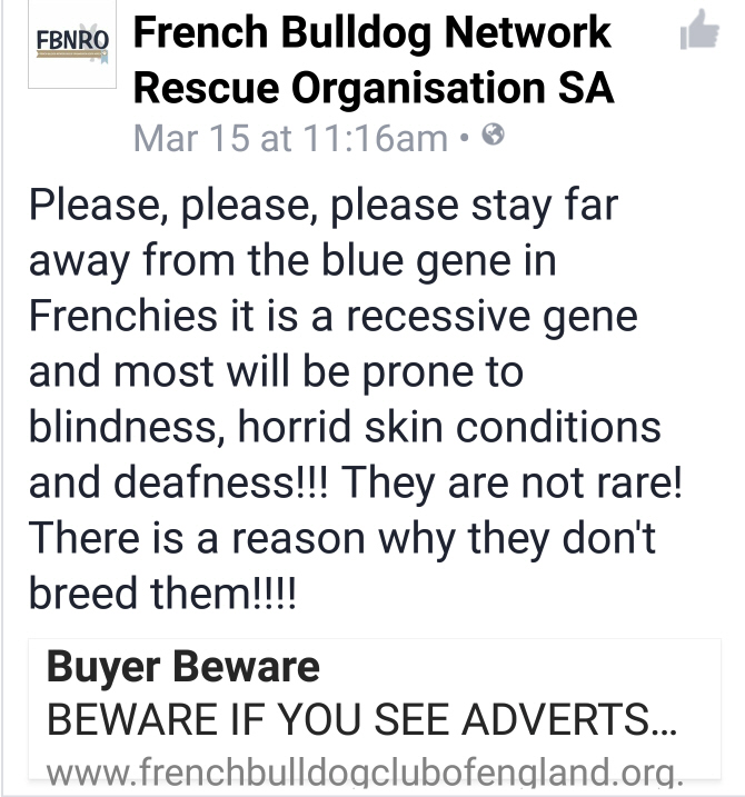 These "RARE" COLORS ARE UNACCEPTABLE BECAUSE THEY ARE CREATED THOUGH A RECESSIVE GENE WHICH MAY CAUSE PHYSICAL PROBLEMS in the FRENCHIE.